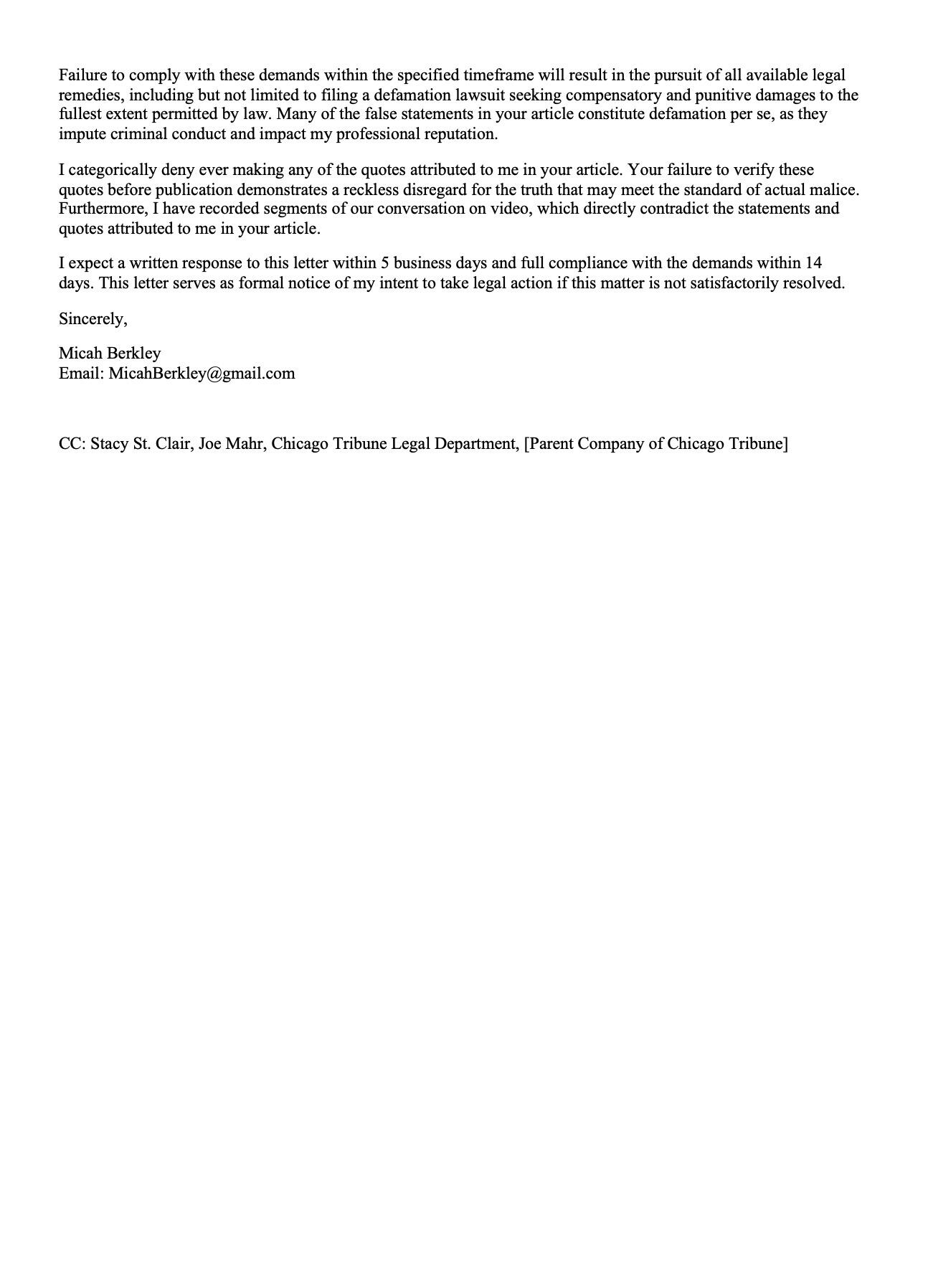 - The parent company of the Chicago TribuneWe are sharing this letter publicly in the interest of transparency and to correct the public record. The letter details the false statements made in the article, provides corrections to these inaccuracies, and outlines my demands for rectification.We will update this post with any response received from the Chicago Tribune.Please find the full text of the demand letter below: