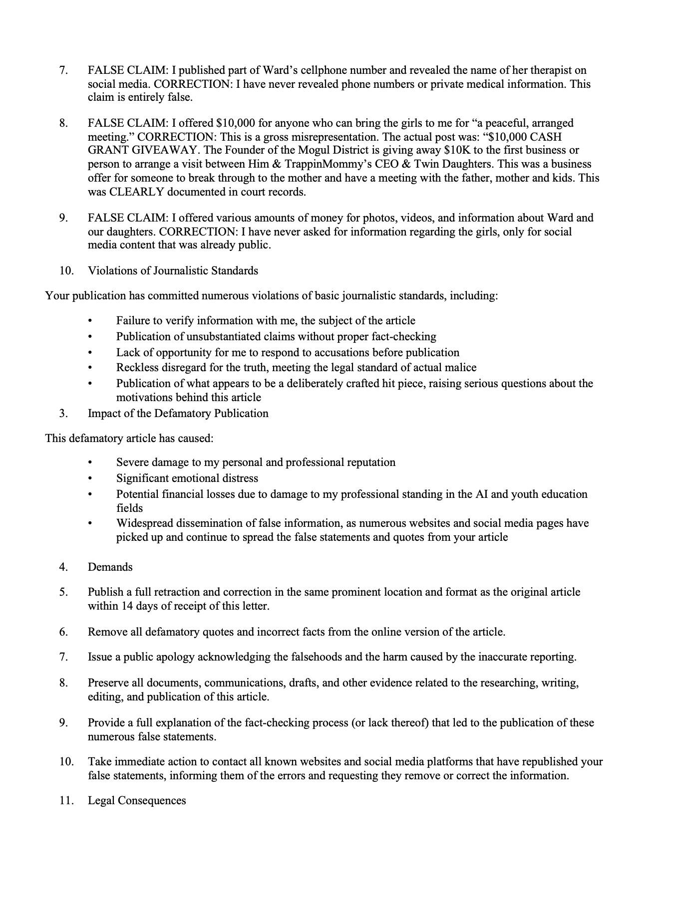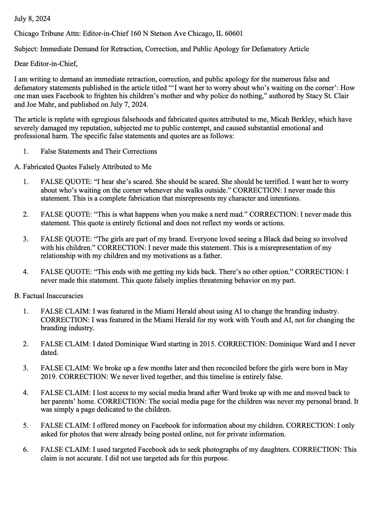 Important Notice Regarding Chicago Tribune ArticleOn July 8, 2024, My team sent the following demand letter to the Chicago Tribune in response to an article published on July 7, 2024, titled "'I want her to worry about who's waiting on the corner': How one man uses Facebook to frighten his children's mother and why police do nothing." This article contained numerous false and defamatory statements about me.The demand letter has been sent to: